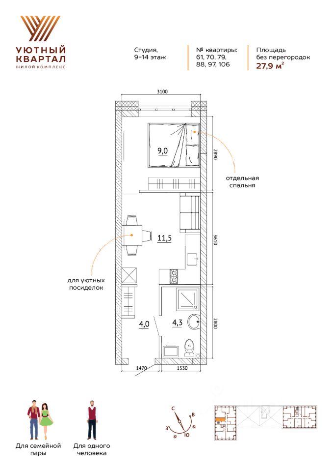 Студия, ЖК ''Уютный квартал'', срок сдачи — IV квартал 2025 года О квартире: 1 взрослый собственник. Материнский капитал не использовался. О комплексе: ''Уютный квартал'' — современный жилой комплекс комфорт-класса. Дома от 5 до 15 этажей. Закрытая дворовая территория. Современные входные группы. Коммерческие помещения на первых этажах. Увеличенная площадь остекления. Подземный паркинг. Колясочные и кладовые. На территории предусмотрены два детских сада и школа. Благоустройство с зелёными зонами, местами для прогулок и отдыха. Приобретая через АН ''Самолёт ПЛЮС'', вы получаете: Юридическое сопровождение сделки. Помощь в оформлении ипотеки на выгодных условиях (в том числе по льготным программам). Поддержку при подготовке документов. Качественный клиентский сервис. Возможность подбора других вариантов от застройщика по Кемерово. Компания работает на рынке недвижимости Кемерово с 2010 года и гарантирует юридическую чистоту сделки. Звонки принимаются с 9:00 до 21:00. macro-1287424