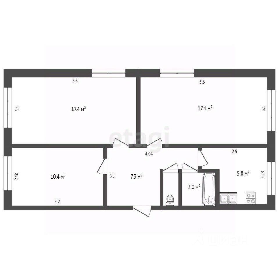Трёхкомнатная квартира 61 м² на 2 этаже 5-этажного дома