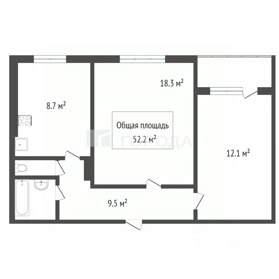 Общая площадь квартиры составляет 52,2 кв.м. из нее жилой 30,4 кв.м. Просторная застекленная лоджия выходит из спальни. Кухня 7,7 кв.м. Санузел раздельный. Квартира в нормальном состоянии. Все окна пвх. На стенах обои, на полу линолеум. Высокий цоколь (ощущение второго этажа).