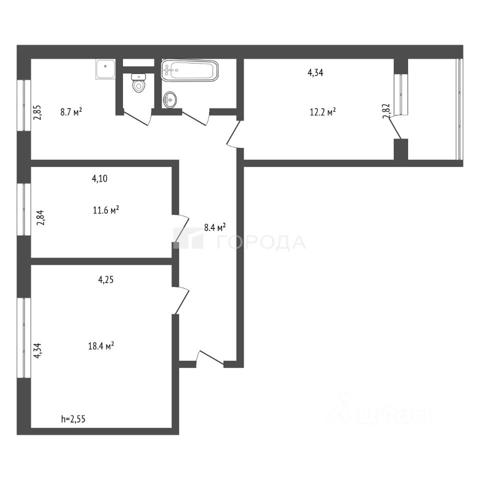 Эта квартира — отличный выбор для семей, ищущих просторное жильё. Общая площадь квартиры составляет 66 квадратных метров, из которых 42,2 квадратных метра — жилая площадь. Три изолированные комнаты (18,4 + 11,6 + 12,2 кв. м) обеспечивают комфорт и уединение для детей и взрослых.