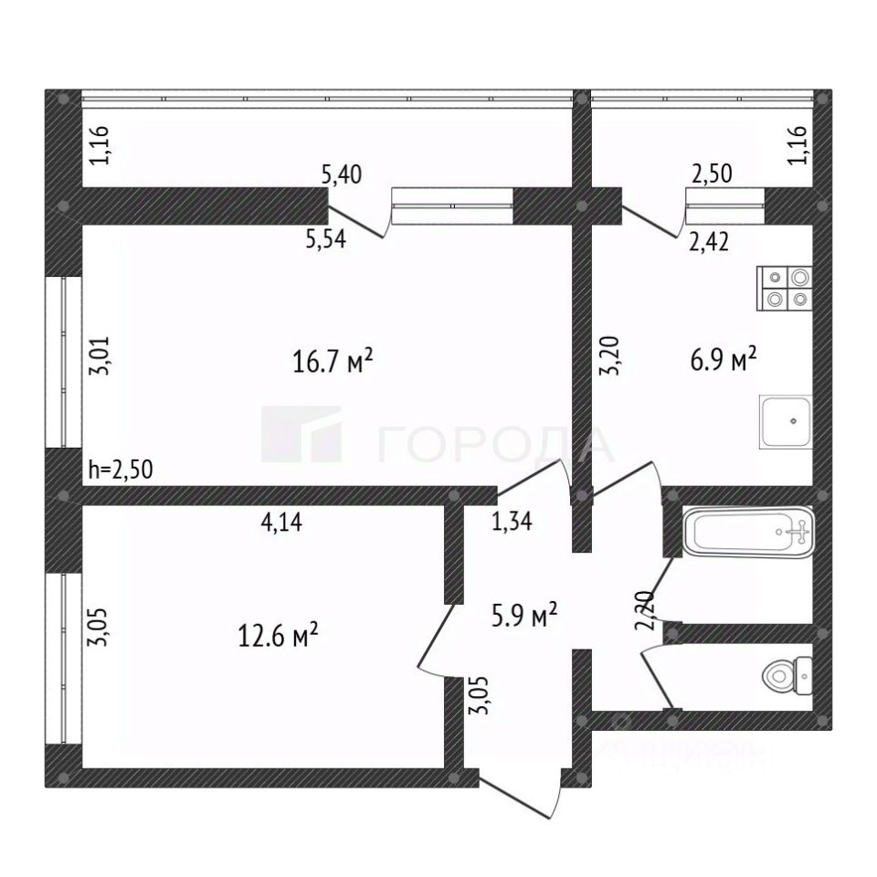 Квартира находится на комфортном 7 этаже 12-этажного дома. Общая площадь — 45,6 кв. м, жилая — 29,3 кв. м (комнаты изолированные и просторные — 17 и 13 кв. м соответственно), площадь кухни — 7 кв. м. В гостиной есть большая, почти 6 кв.м лоджия с видом на площадь общественных мероприятий и Сити Молл, на кухне балкон, с которого открывается вид на дорожную развязку.