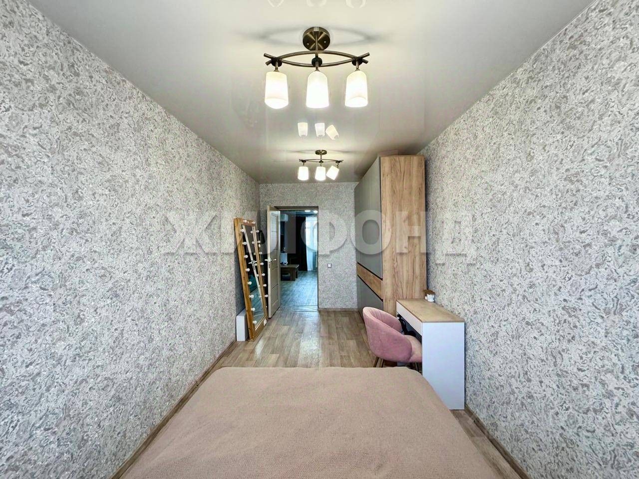 В просторной квартире напольное покрытие линолеум, натяжные потолки, стеклопакеты, выровнены стены, новые двери, стильные обои и световое решение, заменена электрика, с/у раздельный, входная дверь с видеонаблюдением.