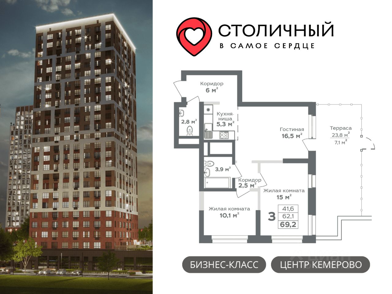 Не подходите под семейную ипотеку? СТАВКА 13,9% ДЛЯ ВСЕХ на весь срок. А первый взнос от 20%! Звоните, поможем определиться с выбором квартиры, подберем самую выгодную программу кредитования и подготовим предварительный расчёт платежей. ---------------------------------------------- ЖК ''Столичный'' — ваше пространство для жизни, развития и отдыха. Всего 5 домов от 25 до 28 этажей. Благодаря панорамному остеклению в квартирах много света и открываются захватывающие панорамные виды на реку Томь, Красное озеро и Московскую площадь. Отделка квартир White box (ровная стяжка пола с шумоизоляцией, улучшенная штукатурка стен, разводка электрики по квартире, межкомнатные перегородки, горизонтальная разводка отопления в полу). Двухуровневый паркинг на -1 и 1 этаже с собственным автомоечным комплексом. Закрытая территория — ваш личный оазис безопасности и комфорта, где нет места для машин. Просторный двор — зона для отдыха и общения, где каждый найдет себе занятие по душе: от современных игровых комплексов до спортивных площадок, окруженных зеленью и ландшафтным дизайном. Ресепшен с консьерж-обслуживанием, куда вы можете обратиться для решения различных бытовых вопросов. Круглосуточный пост охраны на территории жилого комплекса. Премиум фитнес-клуб World Class на территории комплекса — просторные тренажерные залы, бассейны для взрослых и детей, зоны функционального тренинга, SPA-салон. Инфраструктура уже 9 баллов из 10 — здесь расположены детские сады, школа, в пешей доступности торговые центры, крупные спортивные объекты ледовый дворец ''Кузбасс'', спорткомплекс ''Кузбасс-Арена''. ---------------------------------------------- Успейте приобрести квартиру по самым низким стартовым ценам! Напишите в чат - ответим на все ваши вопросы!