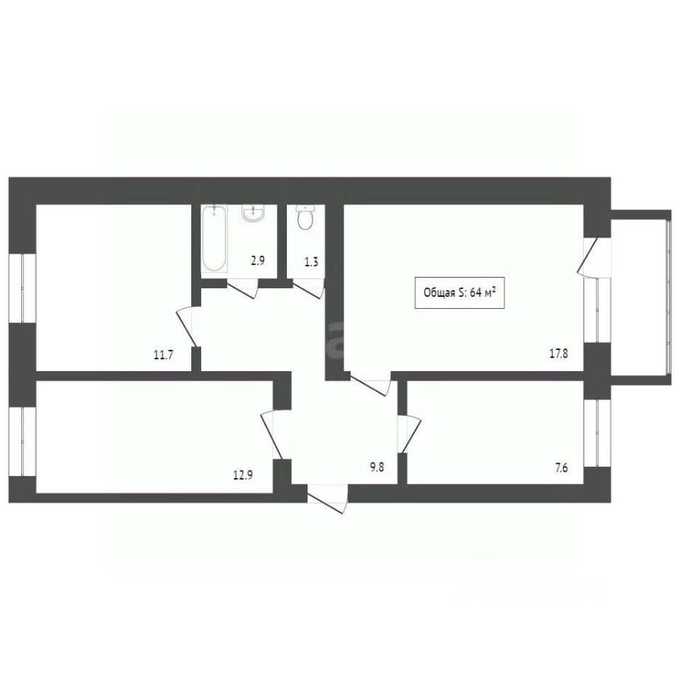 Трёхкомнатная квартира общей площадью 52.7 кв/м..