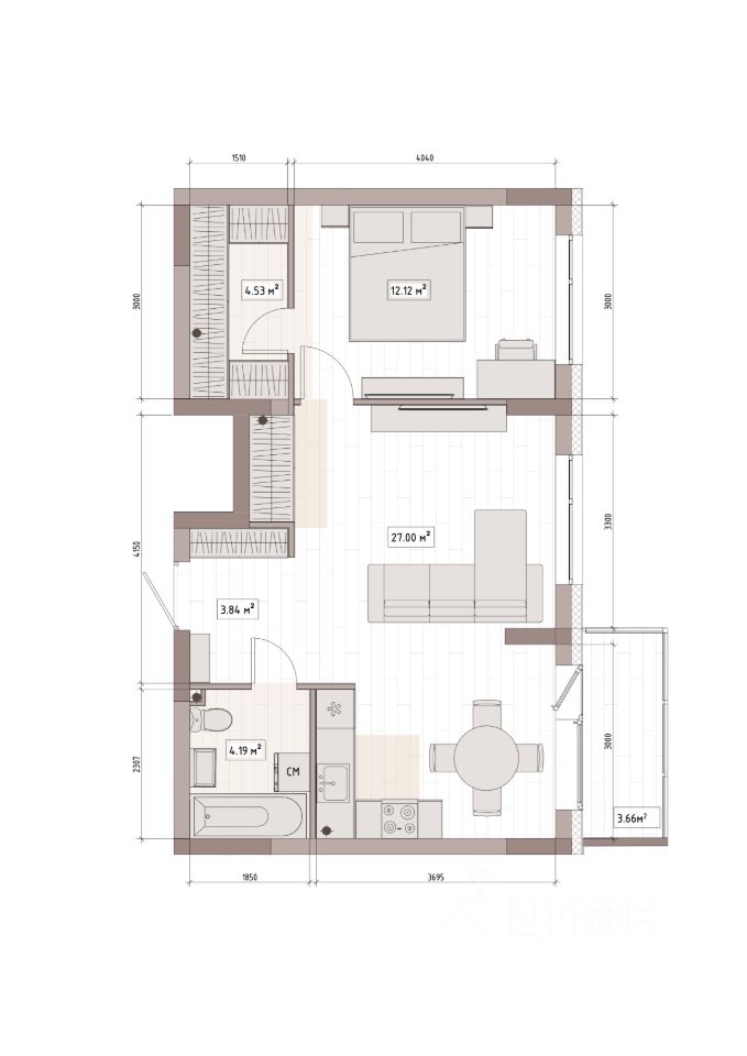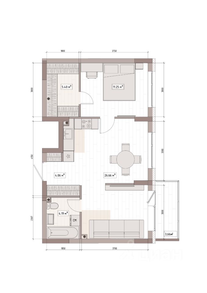 Общая площадь54,3 м2