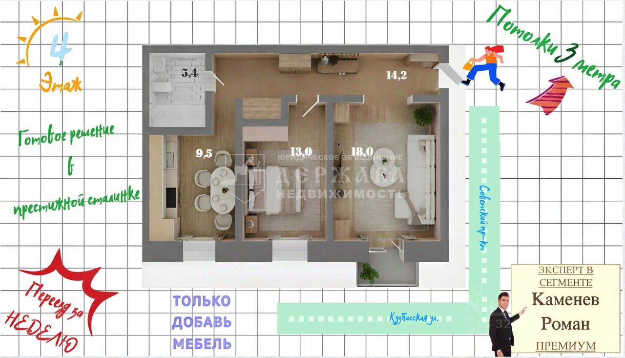 Код объекта: 2011404. Уникальное предложение в сердце Кемерова: просторная двухкомнатная квартира c ремонтом на Советском проспекте, 33. Этот кирпичный дом 1958 года постройки отличается своей надёжностью и комфортом. Квартира расположена на 4 этаже ( не угловая ). Дом снаружи и внутри в прекрасном состоянии. Общая площадь составляет 60,7 м². Гостиная 18 м², спальня 13,6 м². Просторную кухню площадью 9,5 м². Высокие потолки 3 метра, потолки покрашены. В квартире сделан свежий ремонт: пол, стены, проводка, санузел. Окна деревянные со стеклопакетом. Лучшее предложение в Центре города по состоянию цена - качество. Остается только завести мебель. Быстрей выход на сделку.