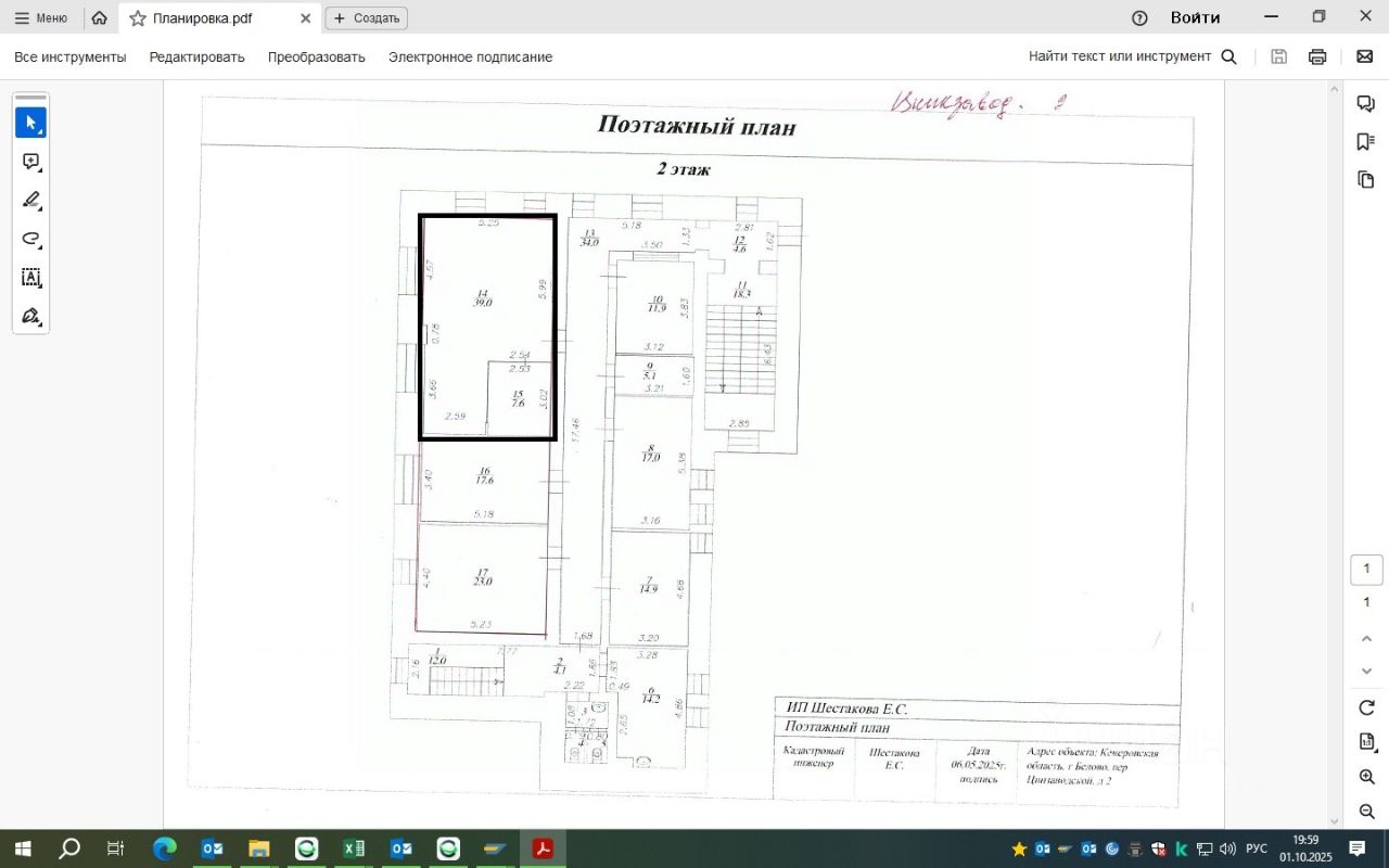 Недвижимое имущество расположено на земельном участке площадью 1426 кв. м: Кадастровый номер: 42:21:0108001:5 ВРИ: административное здание Категория земель: земли населенных пунктов Права на земельный участок: собственность