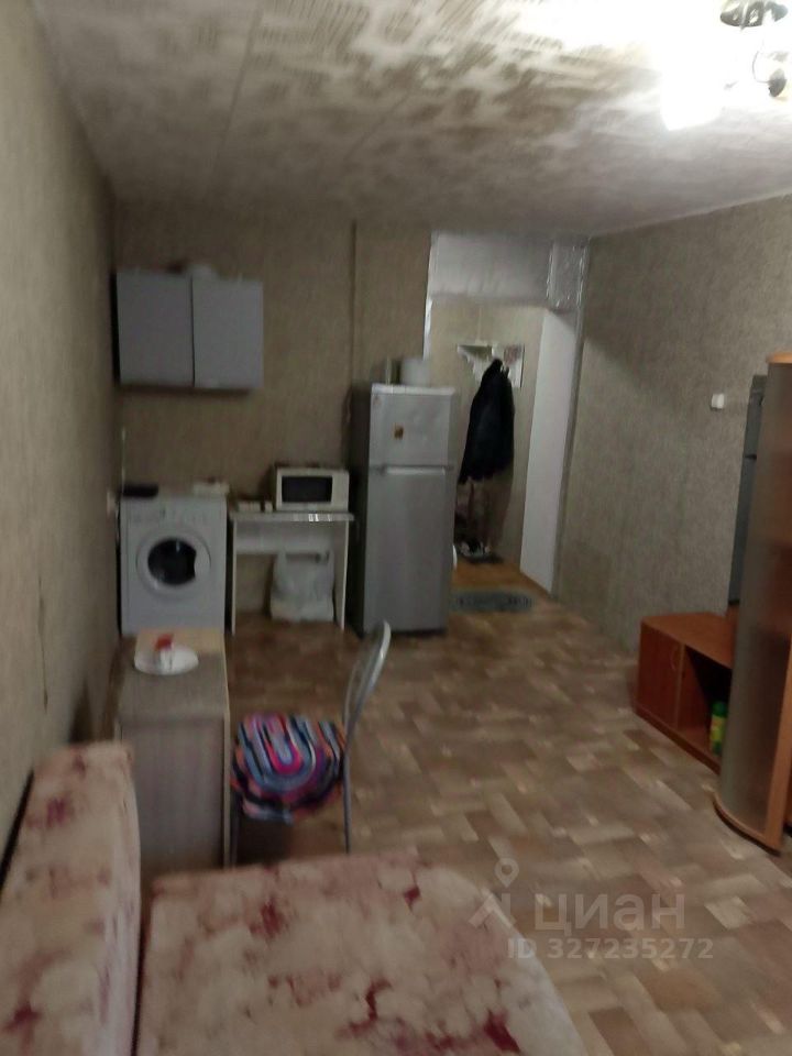 Внутри выполнен косметический ремонт. В комнате установлен шкаф и диван. Из бытовой техники имеется холодильник и стиральная машина. Санузел совмещенный, оформлен плиткой.